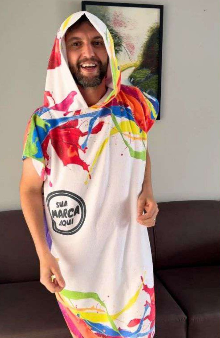 Poncho Personalizado — conforto, praticidade e estilo em uma única peça! Produzido em microfibra felpuda lisa, com composição de 80% poliéster e 20% poliamida (#197 g/m²), o poncho oferece toque suave, alta absorção e secagem rápida, ideal para uso após o banho, na praia, piscina ou academias.